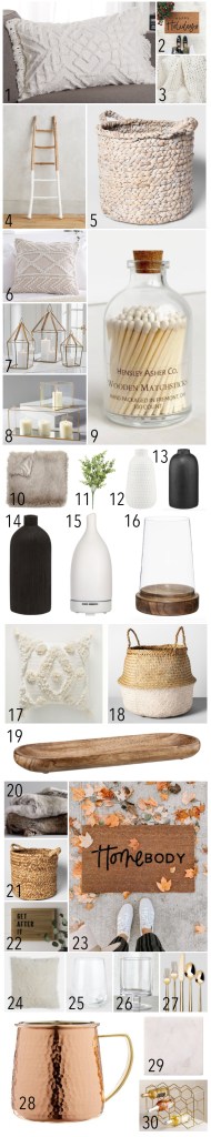 1. Chenille Embroidery Cushion | 2. Happy Holidays Doormat | 3. Chunky Knit Throw | 4. White Dipped Ladder | 5. White Woven Basket | 6. Pom Pom Cushion | 7. Lillian Lanterns | 8. Terrace Lanterns | 9. White Wooden Match Bottle | 10. Grey Faux Fur Throw | 11. Eucalyptus Bush | 12. White Ceramic Vase | 13. Black Ceramic Bottle Vase | 14. Black Textured Bottle Vase | 15. Aroma Om White Diffuser | 16. Glass & Wood Candle Holder | 17. Tufted Mila Pillow | 18. White Dipped Basket | 19. Oval Wood Tray | 20. Faux Fur Ombre Throws | 21. Natural Woven Basket | 22. Wooden Letterboard | 23. Homebody Doormat | 24. Polar Faux Fur Cushion | 25. Cravings by Chrissy Teigen Double Old Fashion Glass | 26. London Hurricane Candle Holder | 27. Gold Flatware Set | 28. Hammered Copper Mule Mug | 29. White Marble Coasters | 30. Gold Hex Wine Rack