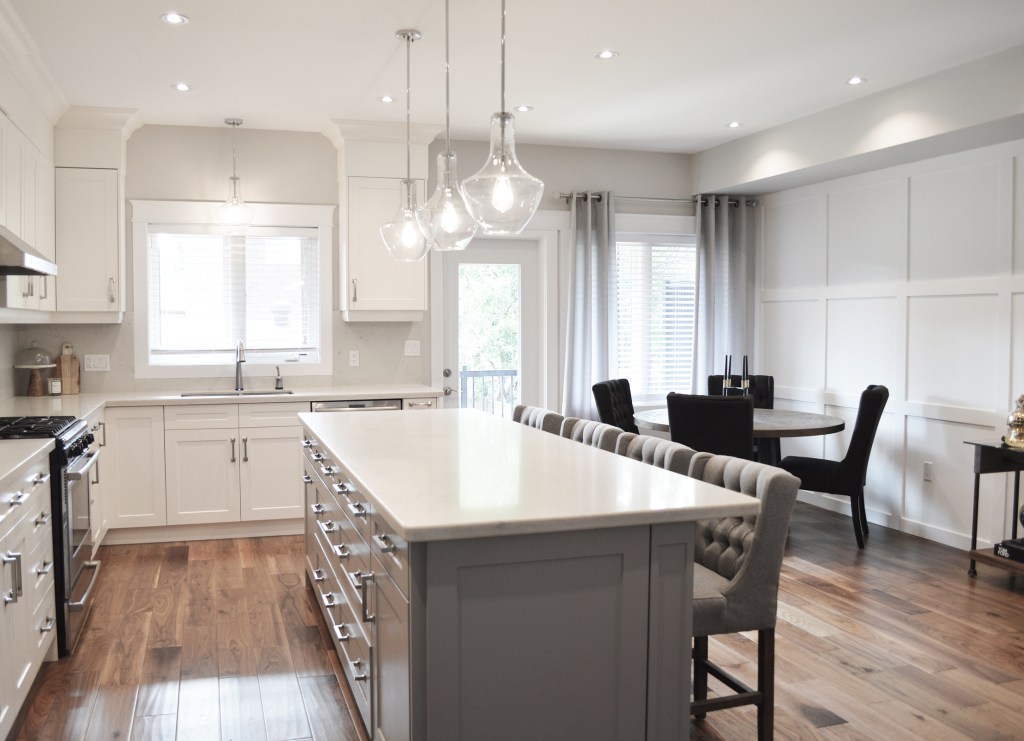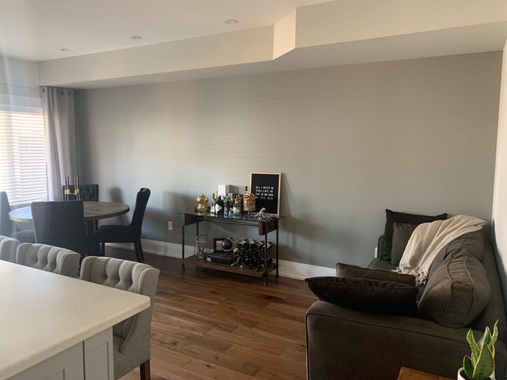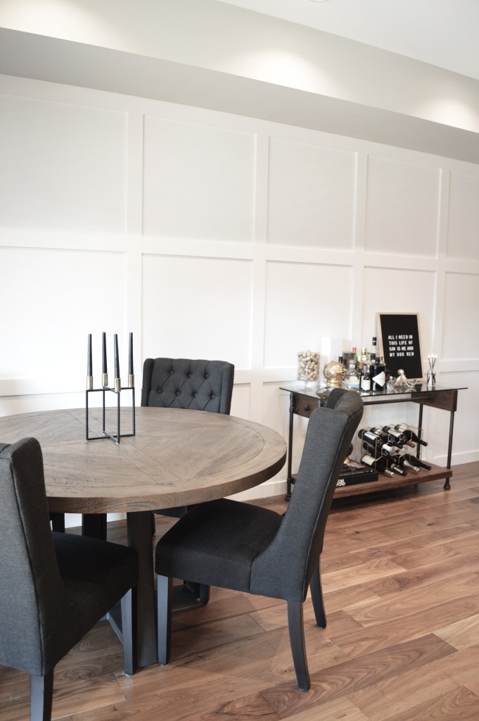 Instead of working on a blog post last weekend, I decided to tackle a home project that we’ve been meaning to do for weeks. Ever since moving into this house, I’ve hated the 19 foot long boring wall across from our kitchen. Because our house is tall and narrow, our main floor layout is a little awkward. Most of the space is taken up by the kitchen and a big 9 foot island that we love, but the rest of the space always just felt like a weird afterthought. I know, the couch doesn’t make it any less awkward – but we’re still on the hunt for a better seating solution and have focused our time (and budget) on other areas of the house. Back to the wall though – as you can see in the before picture below – it’s just bland. The dining, lounging and bar area all felt super disconnected. I didn’t want to hang any art because we’re still working on the furniture layout. I knew I couldn’t convince Matt to paint the whole kitchen white – but I knew I could convince him to do something to this space if he was able to use his power tools. That’s when I decided to reel him in and convince him to do a board and batten grid feature wall to add some depth to this space.