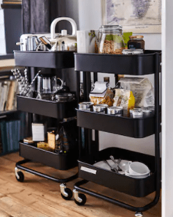 This cart is a bit more compact making it a better option for space saving. It is available in a few different colours, so if the black Nissafors cart isn’t your cup of tea – you may have more luck with this one. The deeper shelves make this cart better for practical storage, not just styling. There are so many uses for this cart – from bathroom storage to kitchen storage, from a portable crafting station to a portable bar station – the options are endless.