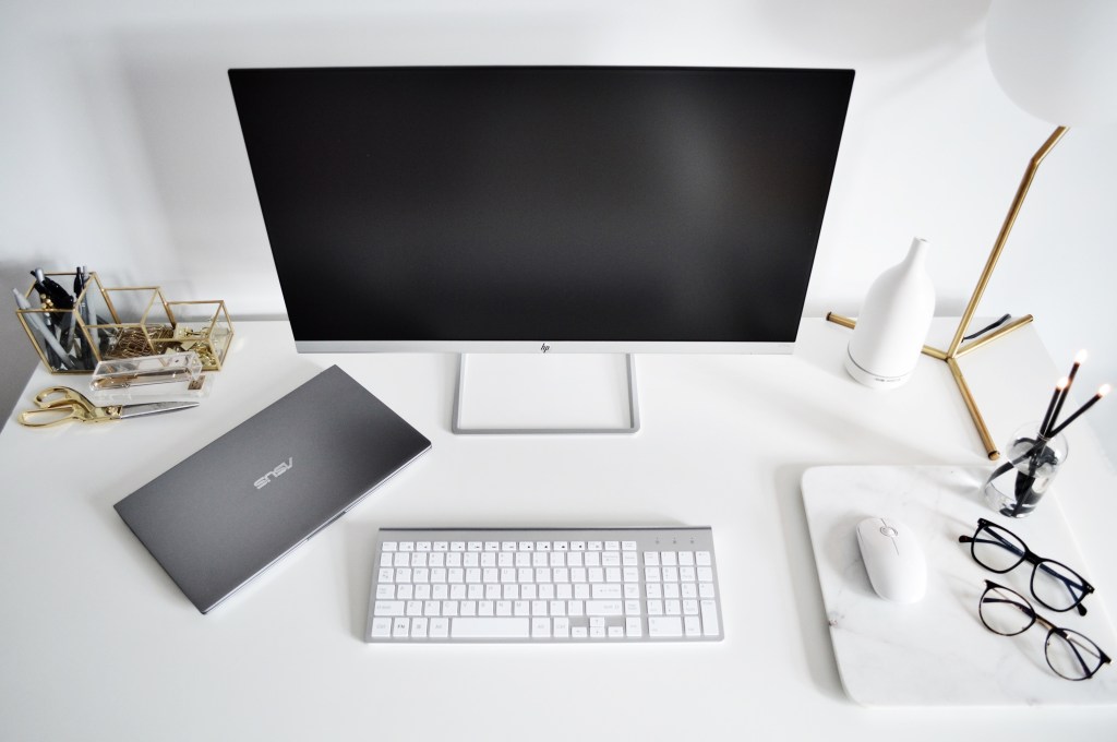 Since Matt is far more into technology research than I am, I leaned on him and he found the ASUS Zenbook which fit all the specs I needed. My top priority for the monitor was the way it looked, so I picked the HP 27″ FHD Monitor because it had the cleanest stand and a white back – it also works great – bonus… Having a keyboard with a number pad and a separate mouse are key for design programs as well, so I found a white/silver option on Amazon to match my monitor.