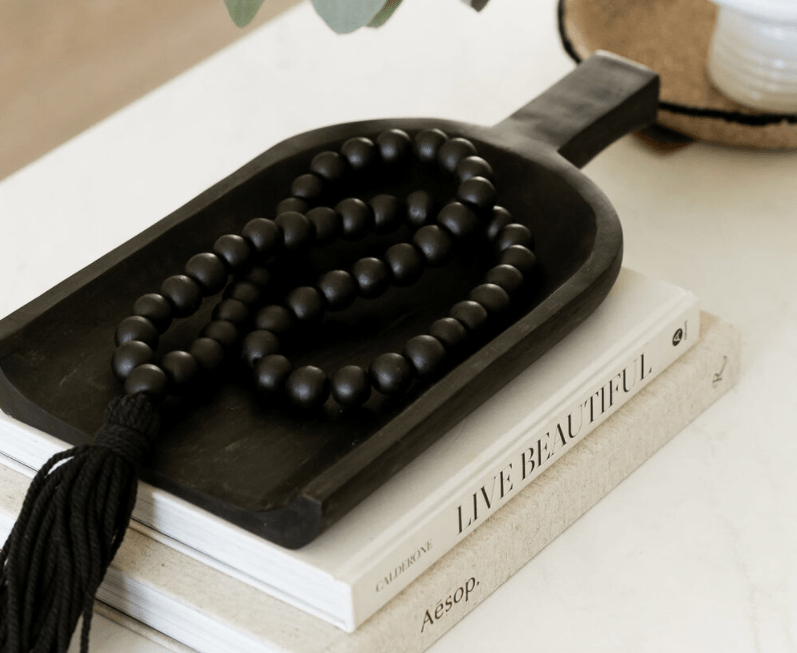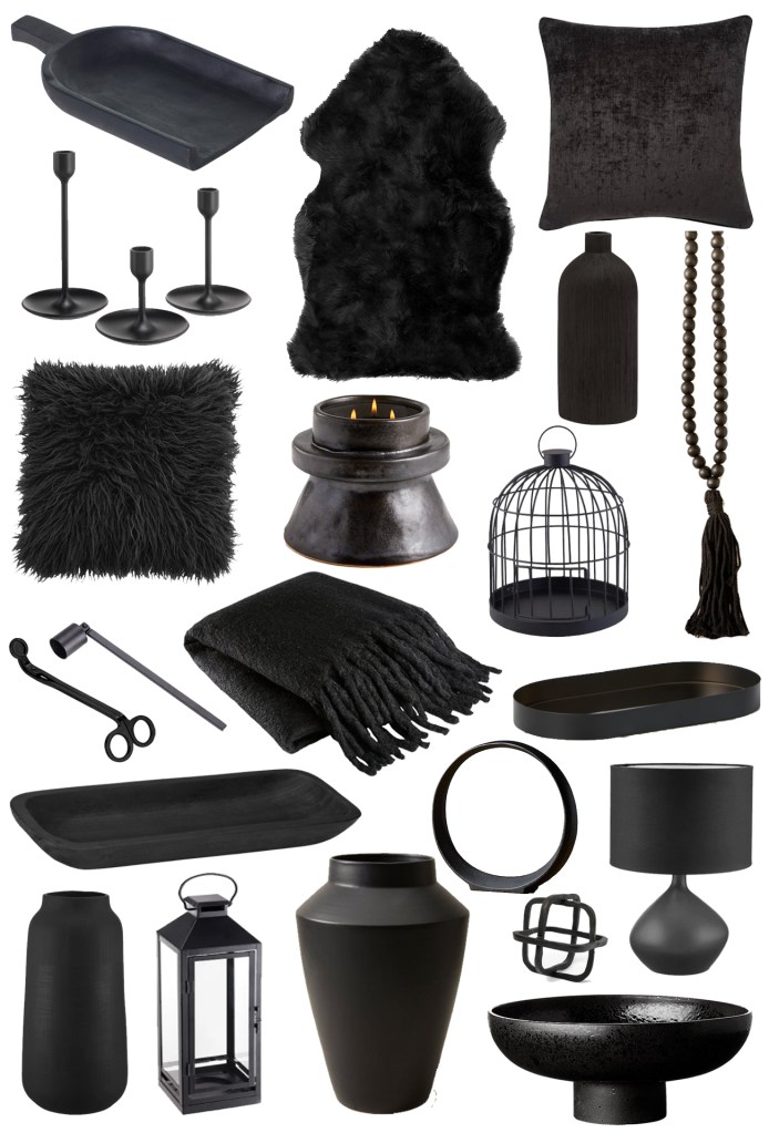 FROM TOP LEFT: The Prairie Shoppe Black Woodfire Tray $39.95 | Hudson’s Bay Black Sheepskin Rug $64.99 | Urban Barn Clooney 24″ Throw Pillow $42 | IKEA FULLTALIG Candle Holders $16.99 | Bouclair Black Textured Bottle Vase $16.99 | The Prairie Shoppe Black Boho Beads $30 | Hudson’s Bay Black Mongolian Throw Pillow $25 | Crate & Barrel Chloe Medium Candle $74 | IKEA LINDERANDE Decorative Cage $22.99 | Amazon Matte Black Wick Trimmer $16.99 | Amazon Matte Black Candle Snuffer $16.99 | CB2 Marlee Black Fringe Throw $114 | Structube Judd Tray $10 | Bouclair Black Decorative Wood Tray $24.99 | CB2 Small Metal Ring Sculpture $59.95 | Overstock Black Decorative Object $81.99 | Bouclair Matte Black Ceramic Lamp $79.99 | Bouclair Black Textured Vase $39.99 | IKEA LAGRAD Black Lantern $39.99 | Chapters Indigo OUI Modern Terracotta Matte Black Glazed Vase $49.50 | CB2 Black Pedestal Bowl $89.95