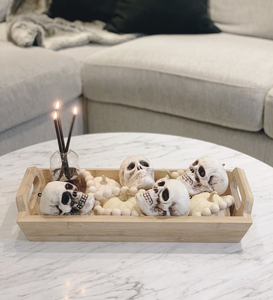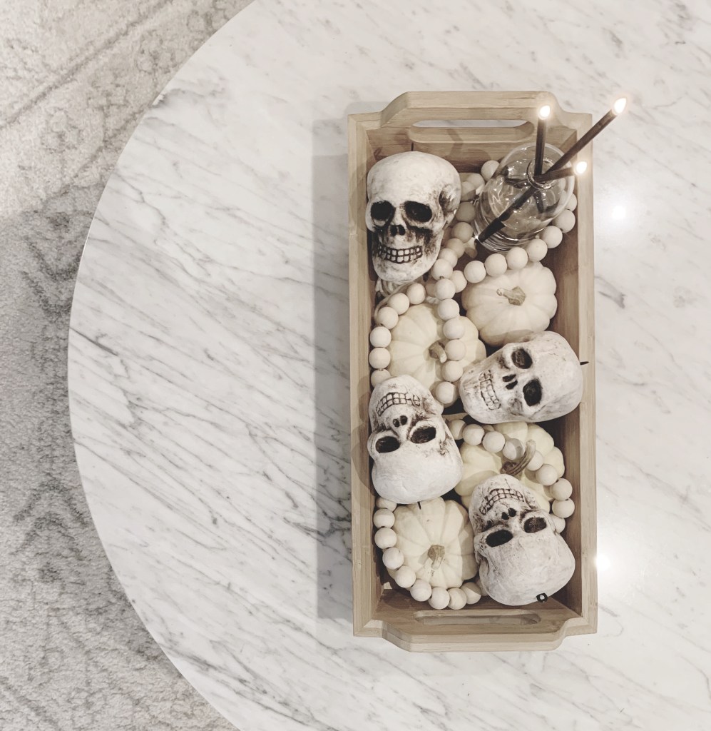 For the coffee table, I threw some white pumpkins, skulls, wooden beads and my black Everlasting Candle Company candles in a wood tray.