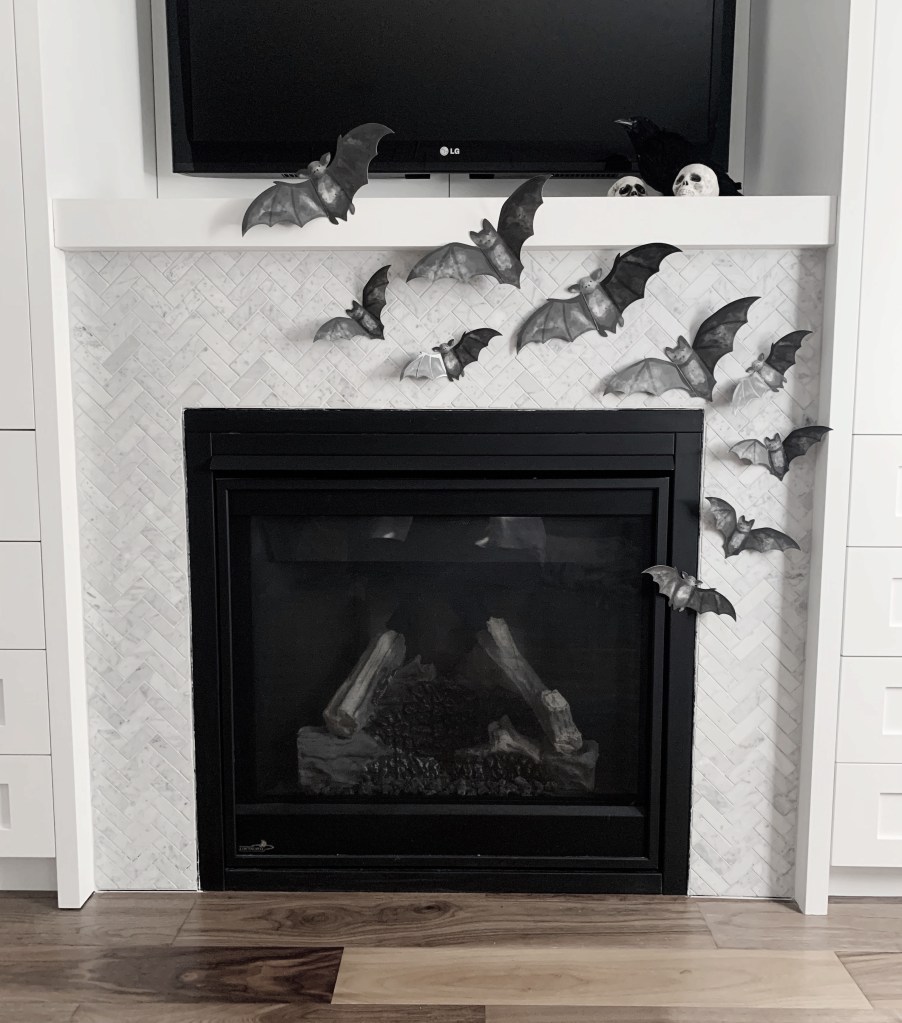 I used the same Martha Stewart Bats on my fireplace because they’re cute but still spooky and I love them the most.