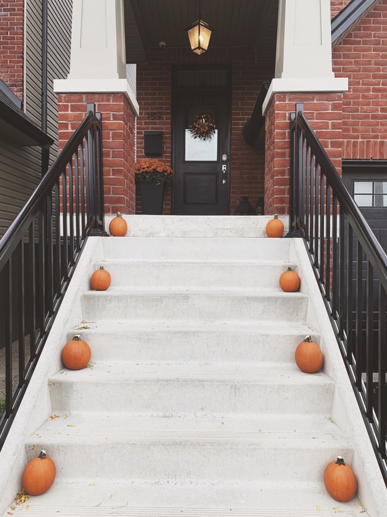For the front porch I haven’t busted out any skeletons or gone full Halloween mode yet, but I added little pumpkins to our steps, threw up the fall wreath and traded our summer planter for some orange mums. I’d love to fill the stairs with pumpkins one day, but we have too many steps and Matt would not be too impressed if I dropped $300 on pumpkins…