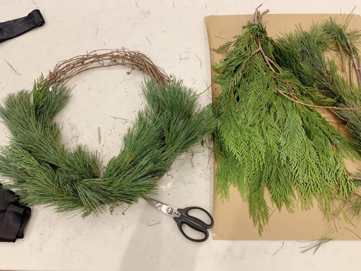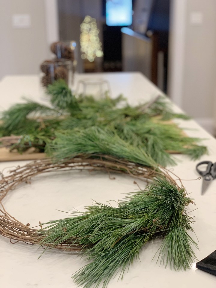 Cut individual fronds/branches from the boughs and lace/intertwine into the grapevine wreath. I usually start by adding in all of my pine first to create the base and then sprinkle in the cedar where I feel like it can use some variation.