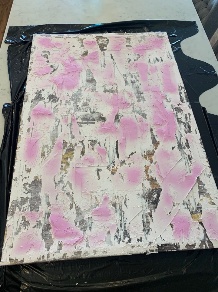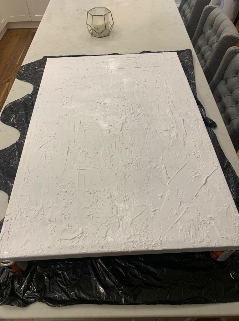 I’m going to start with what I would do differently before you get too far into this. The only drywall compound I had at home was the stuff that goes on pink and dries white. If I were to do this again, I would use one that goes on white/gray as I found it hard to really tell if I was liking the texture I was getting while it was bubble gum pink… I would also have done a quick coat of white paint on the canvas to again eliminate the confusion between the art that was there and the texture I was trying to create. If you’re doing this on a plain or new canvas though – that wouldn’t be a problem.