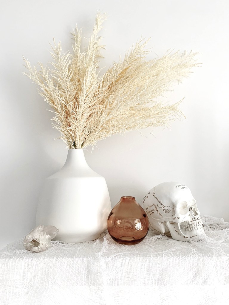 Rather than filling vases with mini pumpkins to decorate my island as I’ve done most other years, I wanted to switch it up this year! Faux black pampas grass from Crate & Barrel, black Everlasting Candles, skulls and this bone clay garland added the perfect amount of texture and contrast.