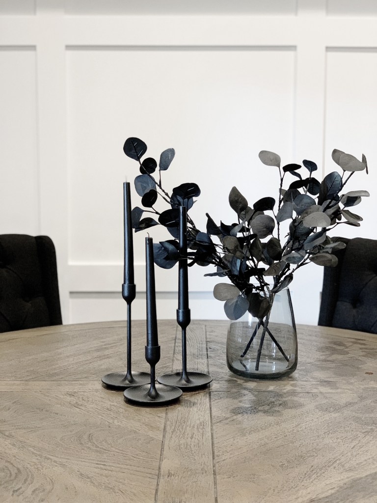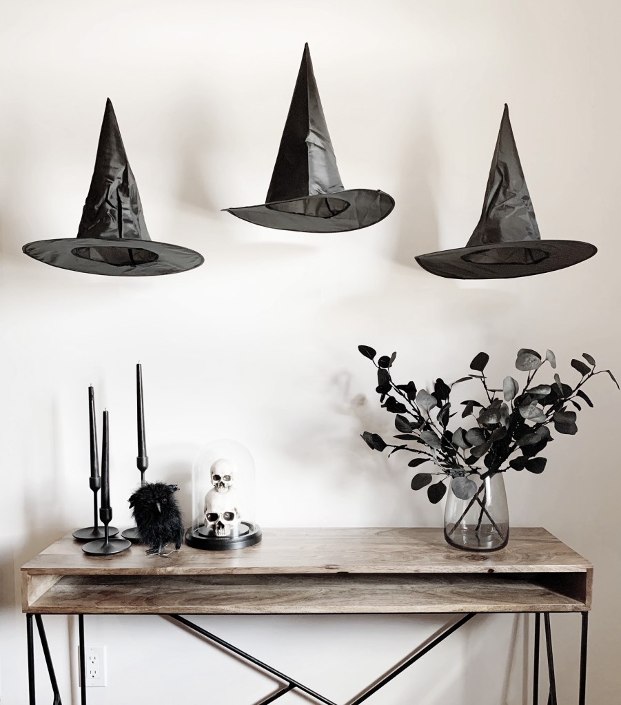 I spray painted some faux eucalyptus stems that I got from IKEA matte black and put them in this smoked glass vase also from IKEA – super inexpensive yet super spooky! I also used fishing line to hang these inexpensive witch hats above the kitchen table and foyer table as well.