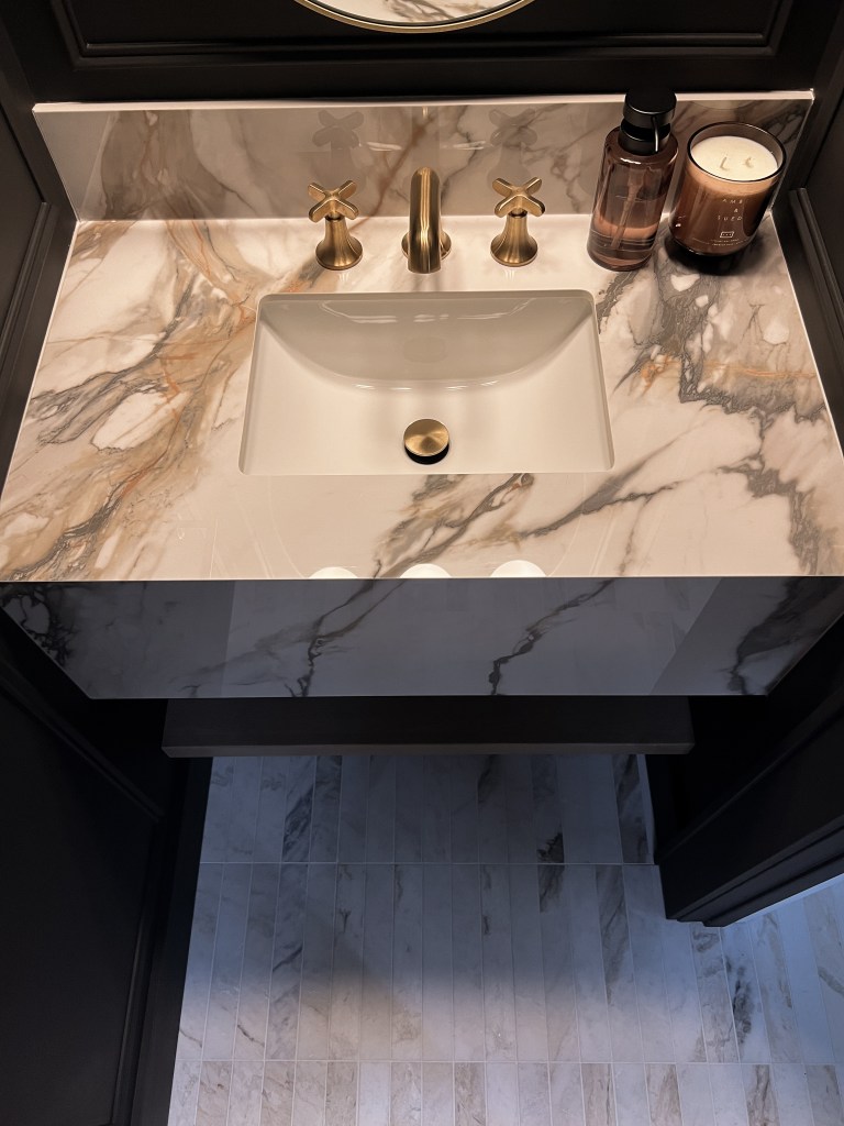 The Arabescato Venato White Honed Marble stack tile that we used on this powder room floor is probably still my favourite tile in our whole renovation – so it still deserves a shout out in this post.