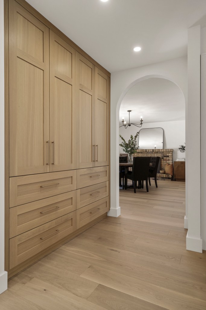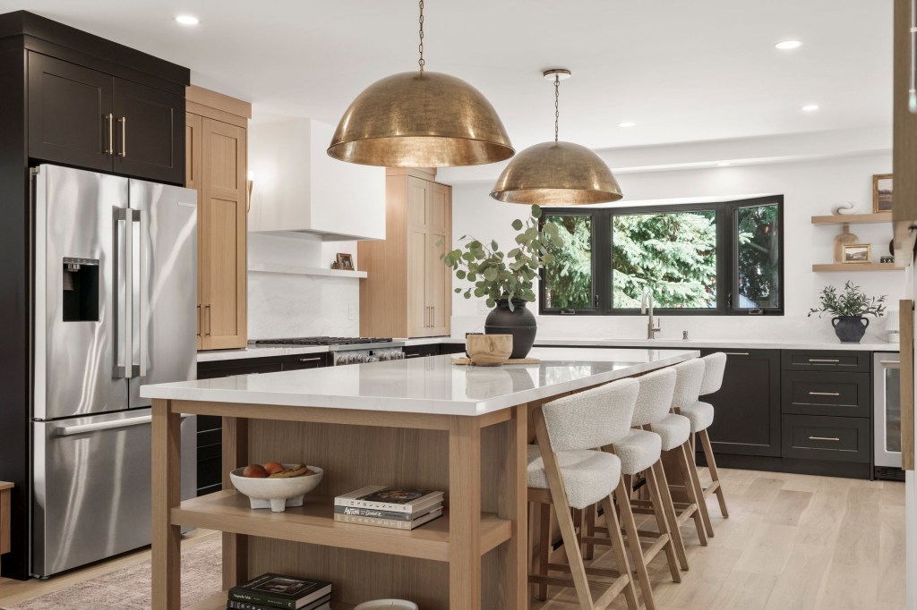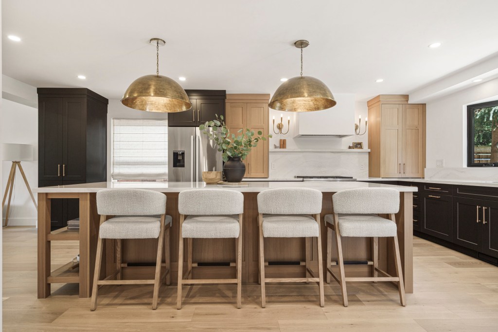 Flooring: Vidar Flooring – European White Oak – Banff | Countertops: Cambria Quartz Everleigh | Sconces: Crate & Barrel Iiona Wall Sconce | Stools: Urban Barn Willaby Counter Stool in Luly Ivory | Cabinet Hardware: Allison by Amerock Destine Pull in Champagne Bronze | Runner: Amber Lewis x Loloi Georgie in Ocean/Sand | Faucet: Delta Trinsic Faucet in Champagne Bronze | Pendants: Large Antique Brass Dome Pendants | Cabinets: Decor Cabinet Company – White Rift Oak Loft & Black Beauty Shaker Door